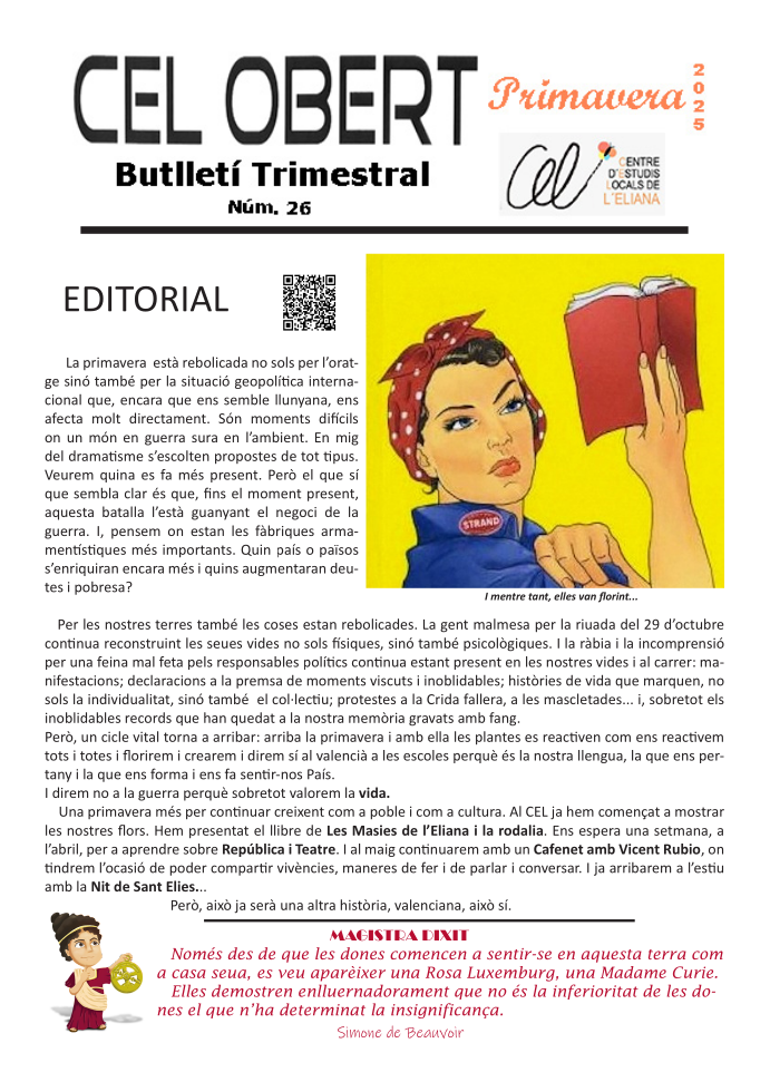 Des del Centre d’Estudis Locals (CEL) de l’Eliana, sense entrar en consideracions que podrien envair un àmbit educatiu que no ens pertoca, volem manifestar el nostre suport a la defensa de la llengua pròpia, sent conscients que el valencià es troba en situació de desavantatge davant el castellà, que és la llengua més emprada a la nostra societat i que compta amb una presència molt més gran en els mitjans de comunicació en qualsevol àmbit.