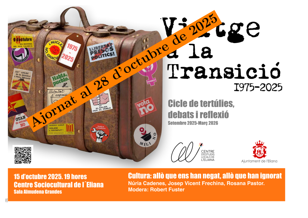 Atès que diversos sindicats han convocat una vaga general per al proper 15 d’octubre, en solidaritat amb el poble palestí, convocatòria a la qual se suma el CEL, la propera sessió de les jornades 1975-2025 Viatge a la Transició, s’ajorna al dimarts 28 d’octubre, al mateix lloc i a la mateixa hora (7 de la vesprada a la Sala Almudena Grandes del Centre Sociocultural)