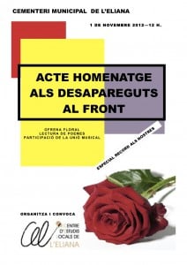 Simplement  recordar-vos que, un any més, el Centre d’Estudis Locals (CEL) de l’Eliana us convoca a tots a l’acte d’HOMENATGE I DE RECORD A LES PERSONES DESAPAREGUDES AL FRONT, acte on es vol recordar a totes les víctimes dels conflictes armats, i en especial als nostres germans elianers caiguts en la guerra civil espanyola de 1936. Aquells fills de la mare Eliana que no tornarem mai al poble on varen nàixer.