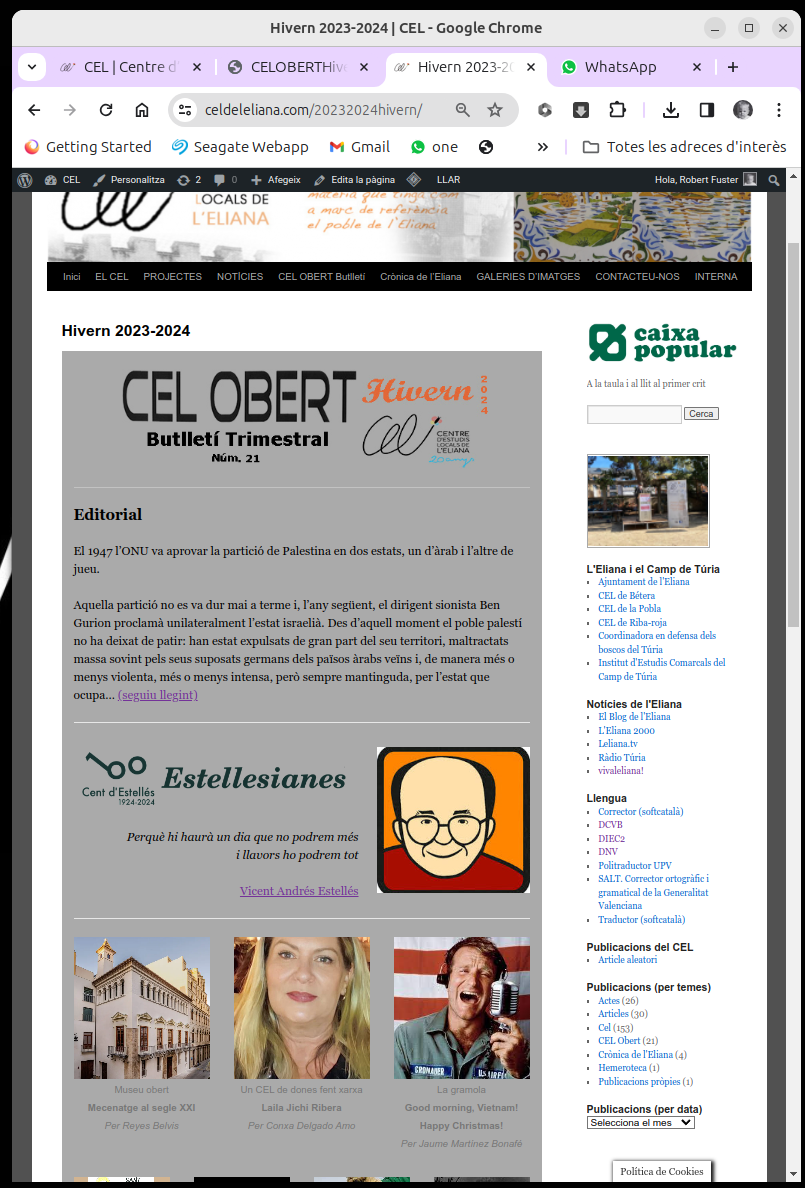 Davant la terrible situació provocada per la DANA, el CEL de l’Eliana se solidaritza amb els pobles germans que han patit profundament les destrosses provocades pel desbordament de rambles i rius. Mostra el seu condol a les famílies i amistats de les persones mortes i es posa a disposició de l’Ajuntament de l’Eliana perquè, si així ho considera, compte amb la nostra associació per a tot allò que considere oportú.